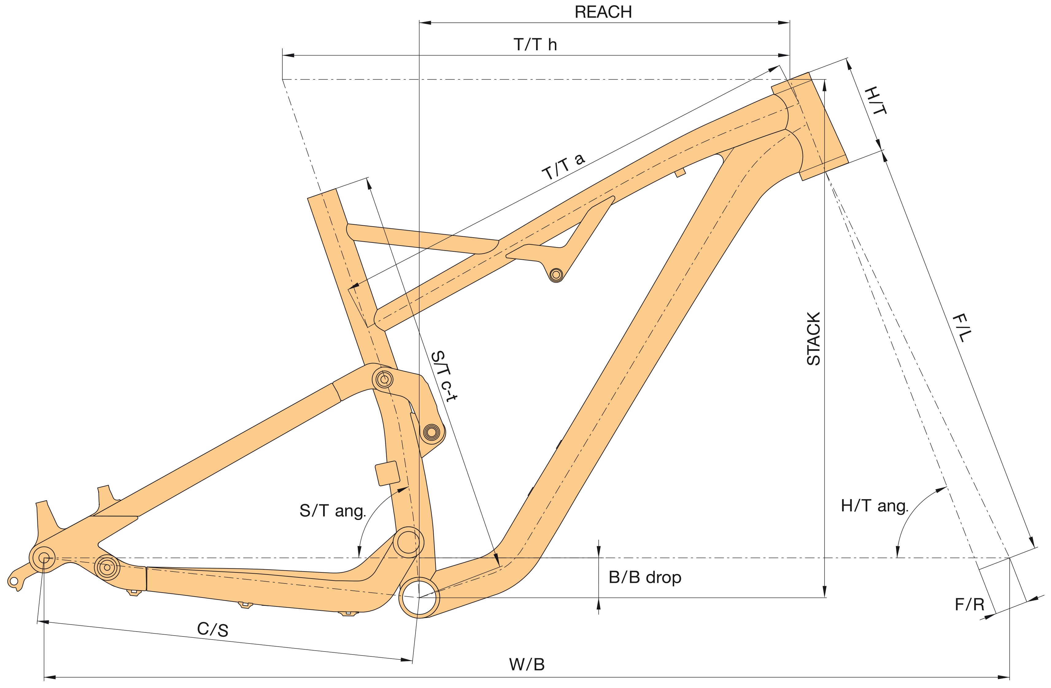 | Veli- kost | min výška | max výška | S/T c-t | S/T c-c | T/T h | T/T a | H/Tt | C/S | W/B | S/T ang. | H/T ang. | F/L | B/B | reach | stack | F/R | hb | stem | crank |