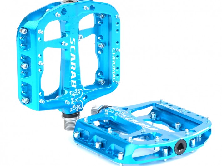 Se svými rozměry a tvarem jsou Scarab jedněmi z největších pedálů na trhu. Profil je velmi tenký - v místě osy pouze 13mm. Precizní CNC opracování sprofilem plochy pedálu vyduté směrem dovnitř. U osy pedálu je tloušťka profilu pouze 13mm pro perfektní a přirozené „držení“ podrážky na pedálu. Vyměnitelné piny z kalené oceli mají skrze podložky volitelnou výšku.Pro dokonalé vyladění, mají Scaraby 40 děr pro piny, tudíž si je může každý jezdec rozmísti dle svých preferencí.