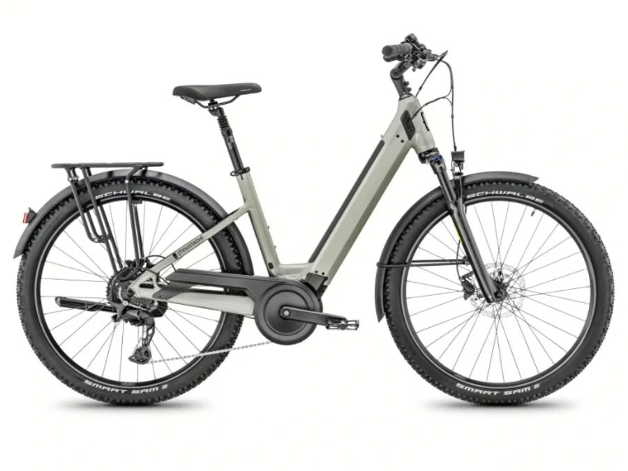 Model Moustache Samedi 27 Xroad ES se nachází přesně na pomezí silnice a terénu – ideální pro každého, kdo hledá univerzální e-bike na každodenní dojíždění i víkendové výlety. Díky otevřenému rámu je nástup i sesedání mimořádně pohodlné. Pohon zajišťuje tichý a spolehlivý motor Bosch Active Line Plus Smart System (50 Nm), který spolu s integrovanou 500Wh baterií nabídne solidní dojezd v každodenním provozu. Vidlice SR Suntour XCM32 se zdvihem 80 mm zvyšuje pohodlí při jízdě po dlažbě, štěrku i lesních cestách. Nechybí ani kompletní výbava: nosič, blatníky, osvětlení AXA 30 a odolné pláště Schwalbe Smart Sam.